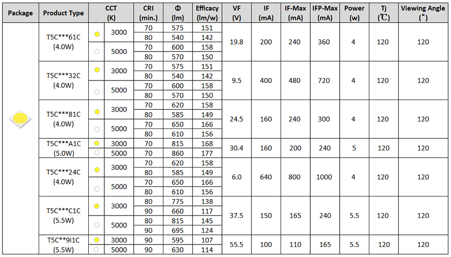 •Reliable EMC package, perfect balance on efficacy, reliability, light quality and system cost