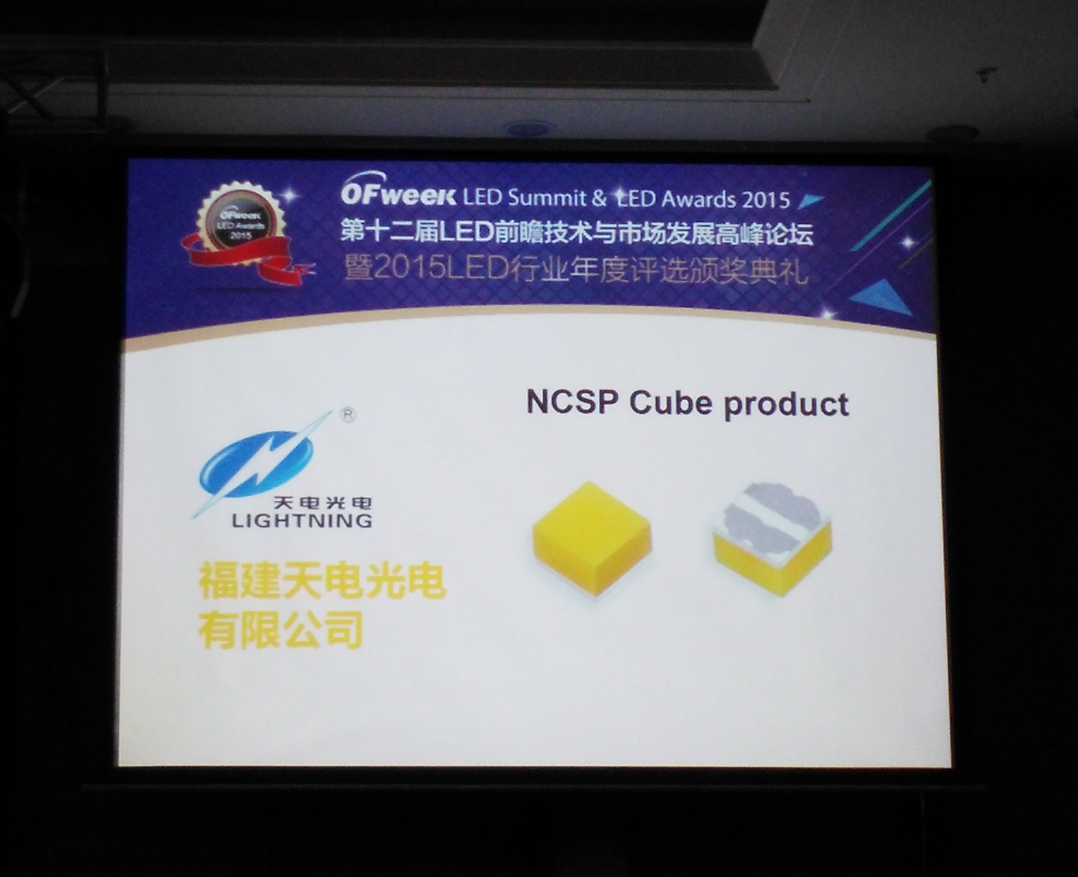 11月18日“OFweek第十二屆LED前瞻技術(shù)與市場(chǎng)發(fā)展高峰論壇暨LED行業(yè)年度評(píng)選頒獎(jiǎng)典禮”在深圳隆重舉行,福建天電光電憑借“NCSP Cube LED”產(chǎn)品獲得“最佳LED光源技術(shù)創(chuàng)新獎(jiǎng)”。