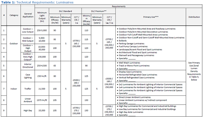 在DLC認證規(guī)范文件內(nèi),對于室內(nèi)/室 外Luminaires 和 Retrofit kits,對于產(chǎn)品的亮度/光效/壽命均提出了一定的要求;
