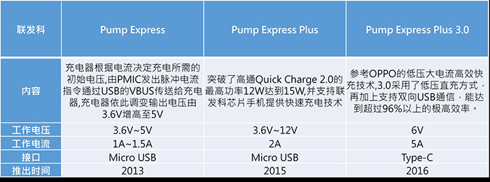 不停依據(jù)電池狀況進行充電電壓調(diào)整,其基本原理類似 QC ,皆為保證電流恒定,并且加大電壓以實現(xiàn)更高的充電功率,更在2016年提出 PE3.0 ,