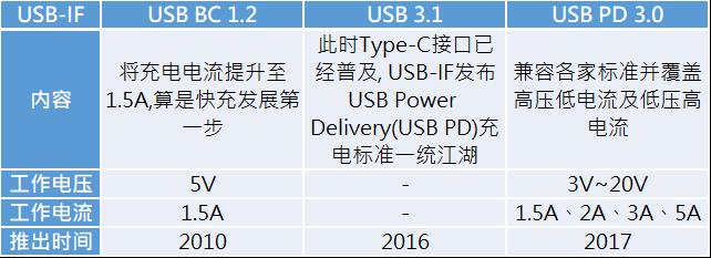 前面提到的 USB BC 1.2 是由 USB-IF于2010年所發(fā)布,這可以算是手機快充的起點,他統(tǒng)一了USB充電規(guī)范混亂的局面,