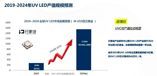 據(jù)行家說的數(shù)據(jù)顯示,在2019-2024年,全球UV LED市場規(guī)模復(fù)合增長率高達(dá)43%,如(圖三)所示。