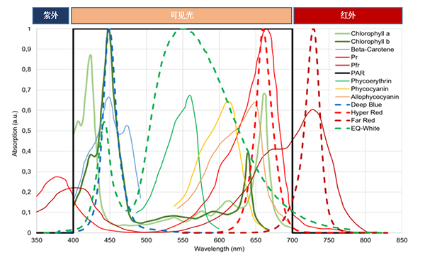 對于植物生長及形態(tài)起著關(guān)鍵作用的植物色素吸收光譜中可以看出,