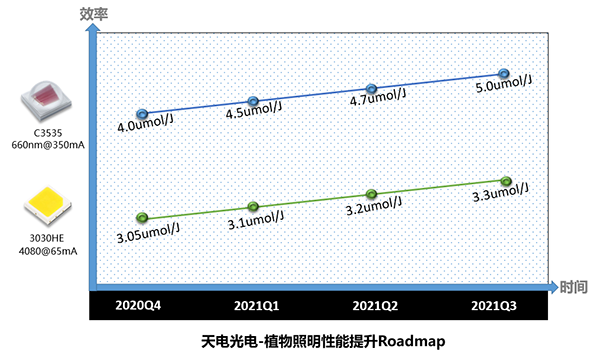 產(chǎn)品采用了增加效率的提亮工藝,其中陶瓷3535-660nm的LED的轉(zhuǎn)化效率高達(dá)73%,產(chǎn)品的PPE效率4.0umol/J,